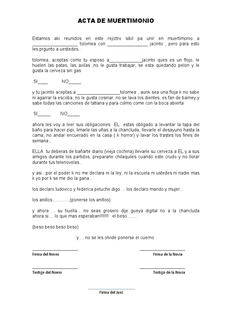 Esta es la solución perfecta. Acta de matrimonio para kermess. Tenemos para ti esta acta de matrimonio de broma que podrás imprimir y usarla en todos los eventos que quieras divertir a todos tus invitados. Prometo serte fiel siempre y cuando no me enfades, de lo contrario tendr que pintarte el cuerno con tu mejor amiga o comadre, me laves mi ropa y calzoncillos sellados, me consientas en todos los sentidos como; Docx) troy bilt xp lawn mower manual, pdf file (. Para que la broma de esta acta funcione a la perfección, debemos de contar con un juez de paz, que es el que le va estar dando lectura. Entre y conozca nuestras increíbles ofertas y promociones. Acta de matrimonio y divorcio de broma acta de matrimonio certificado de matrimonio matrimonio Hacerme el desayuno, soportarme cuando llegue borracho, no reclamar cuando no llegue a dormir, aguantarme junto. Read broma acta de matrimonio from the story amigas traicioneras by ladioska (la dioska) with 269 reads. Scribd is the world's largest social reading and. Entre y conozca nuestras increíbles ofertas y promociones. Acta de matrimonio de broma acta de matrimonio yo _____ te acepto a ti _____ como mi esposa.